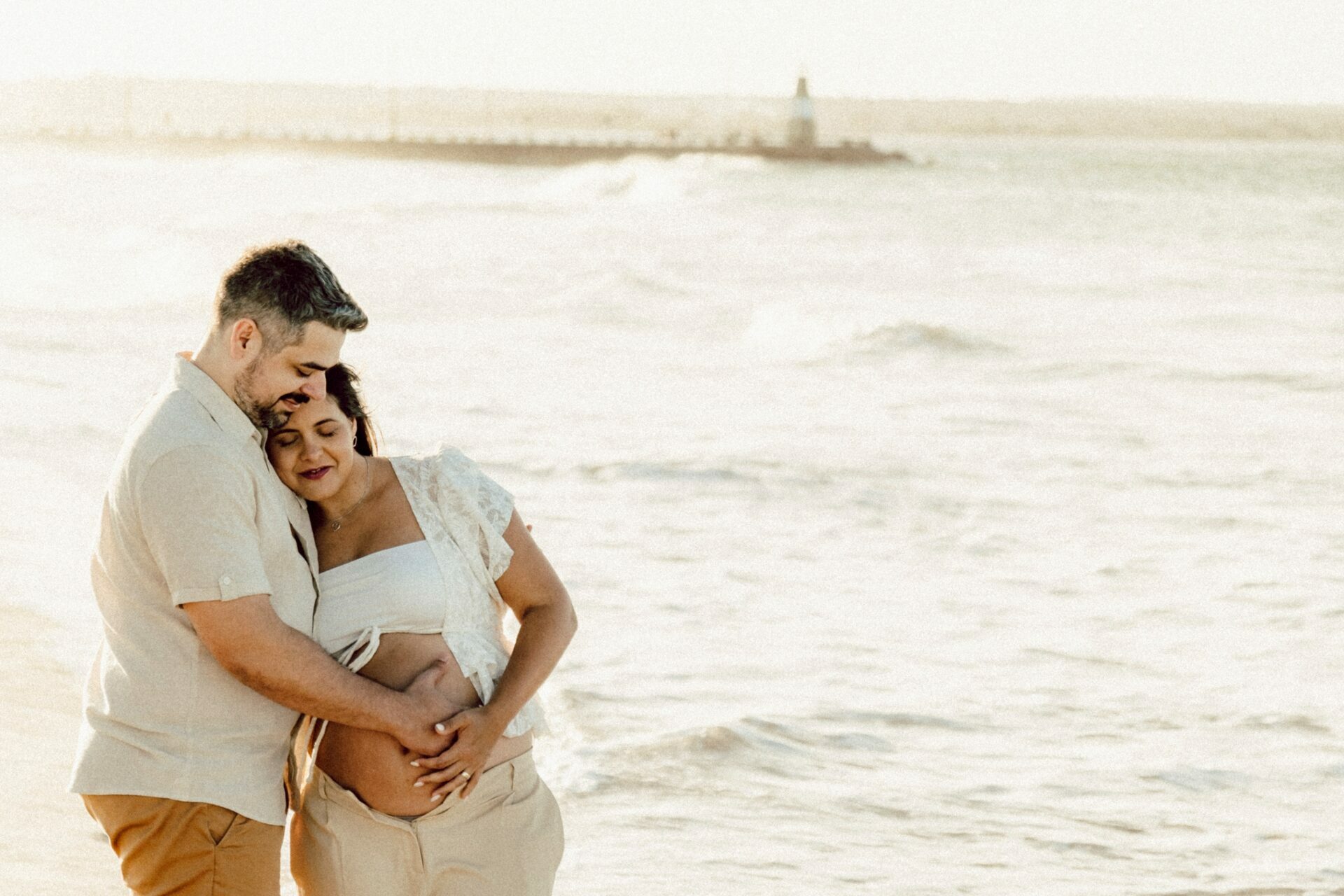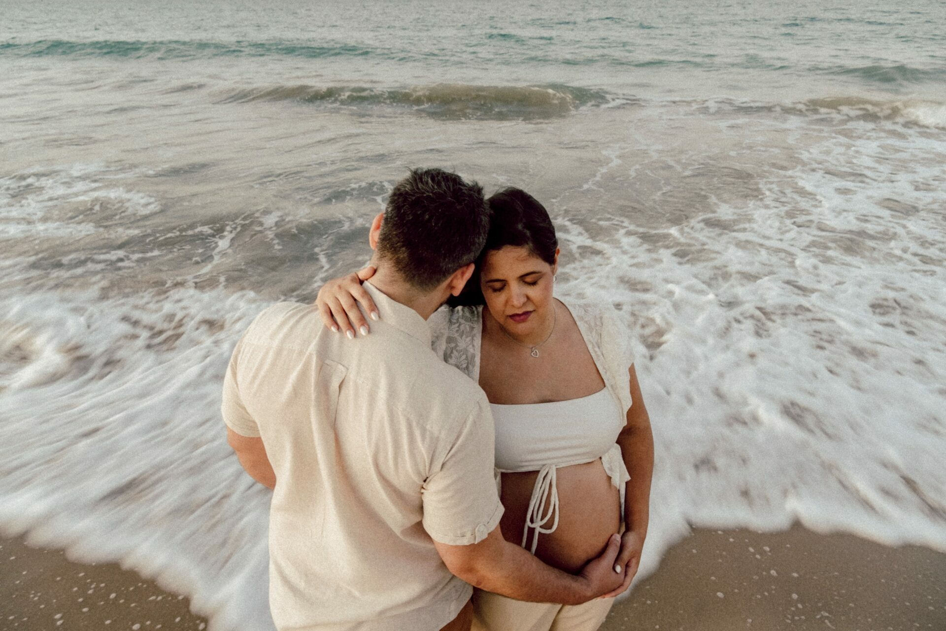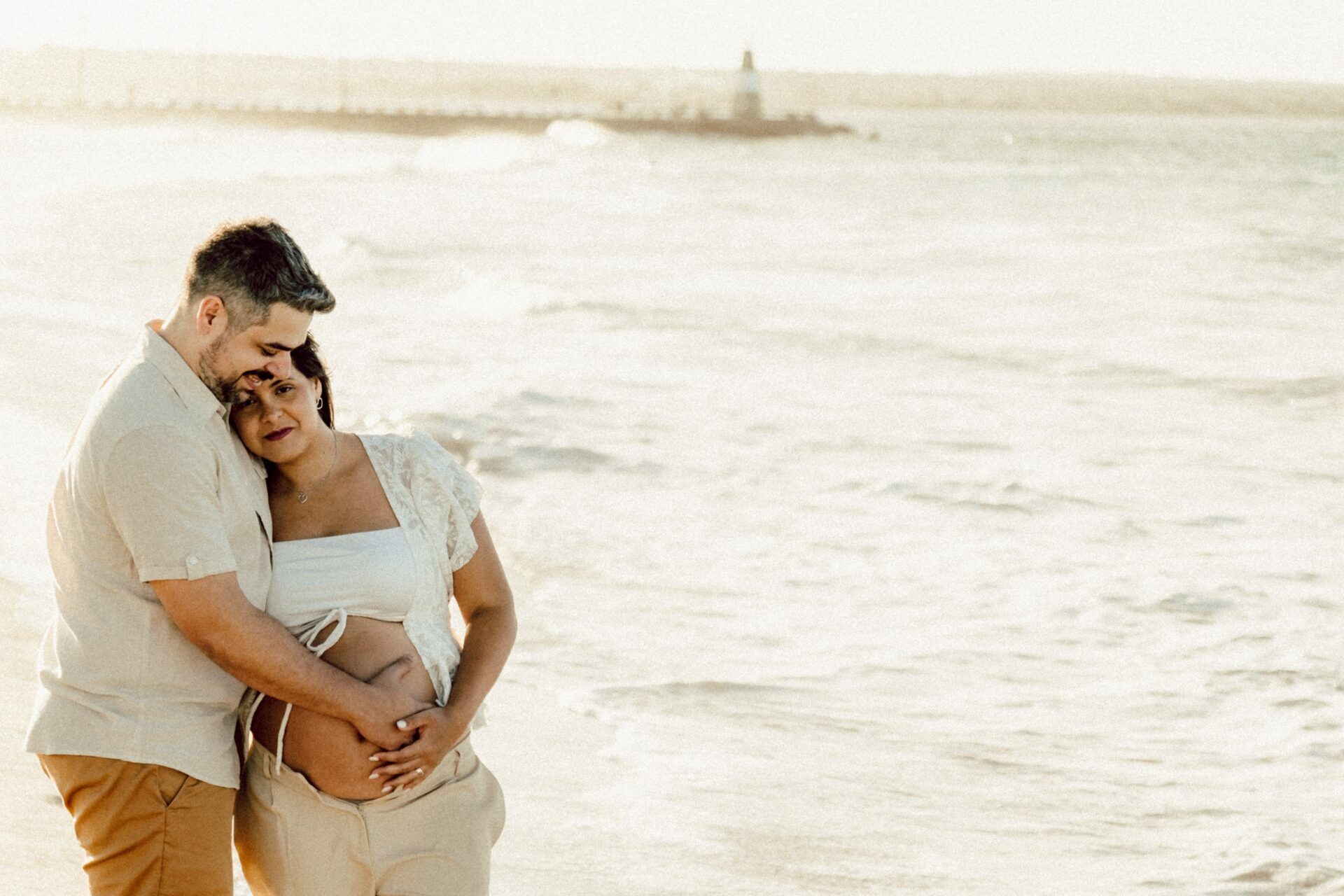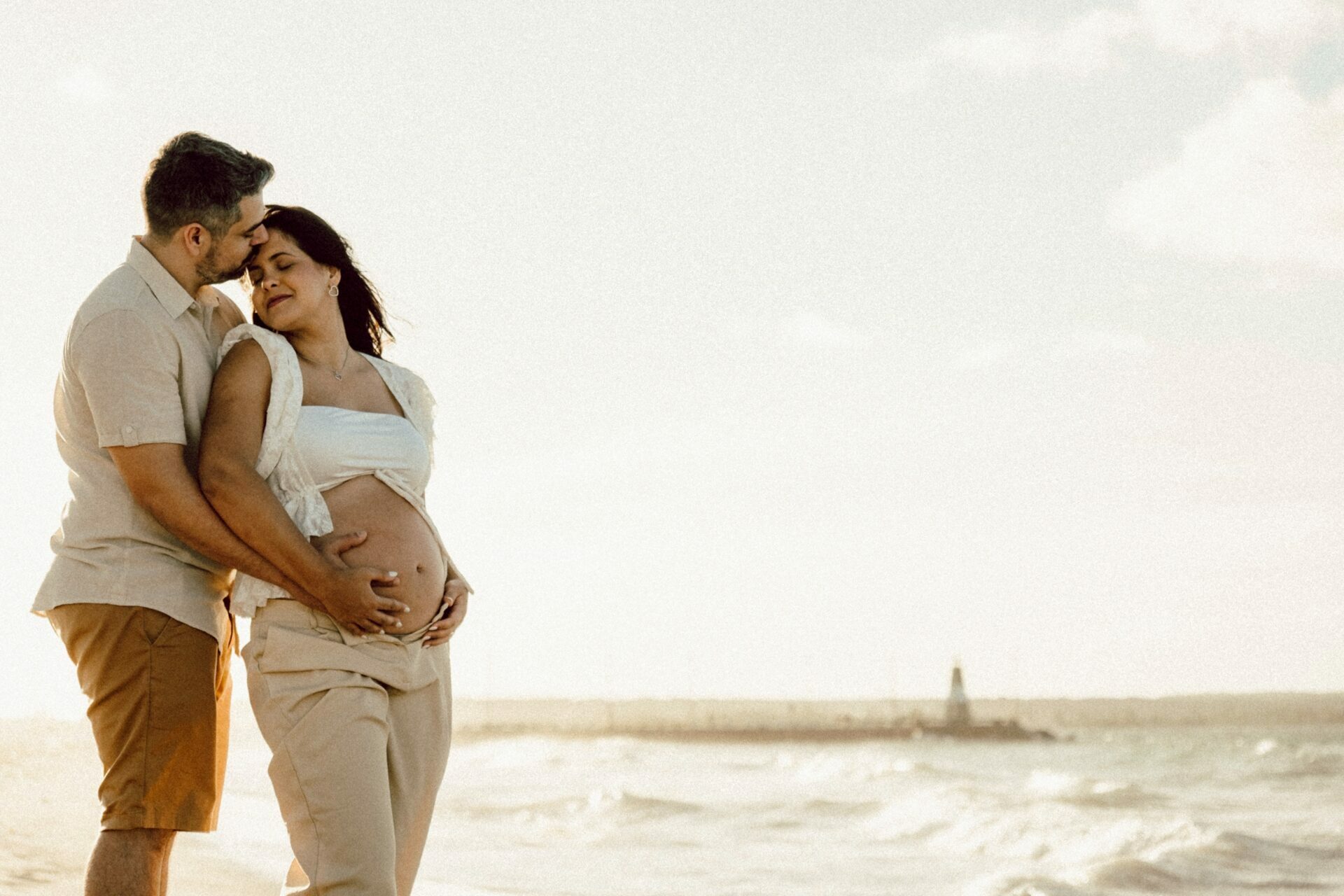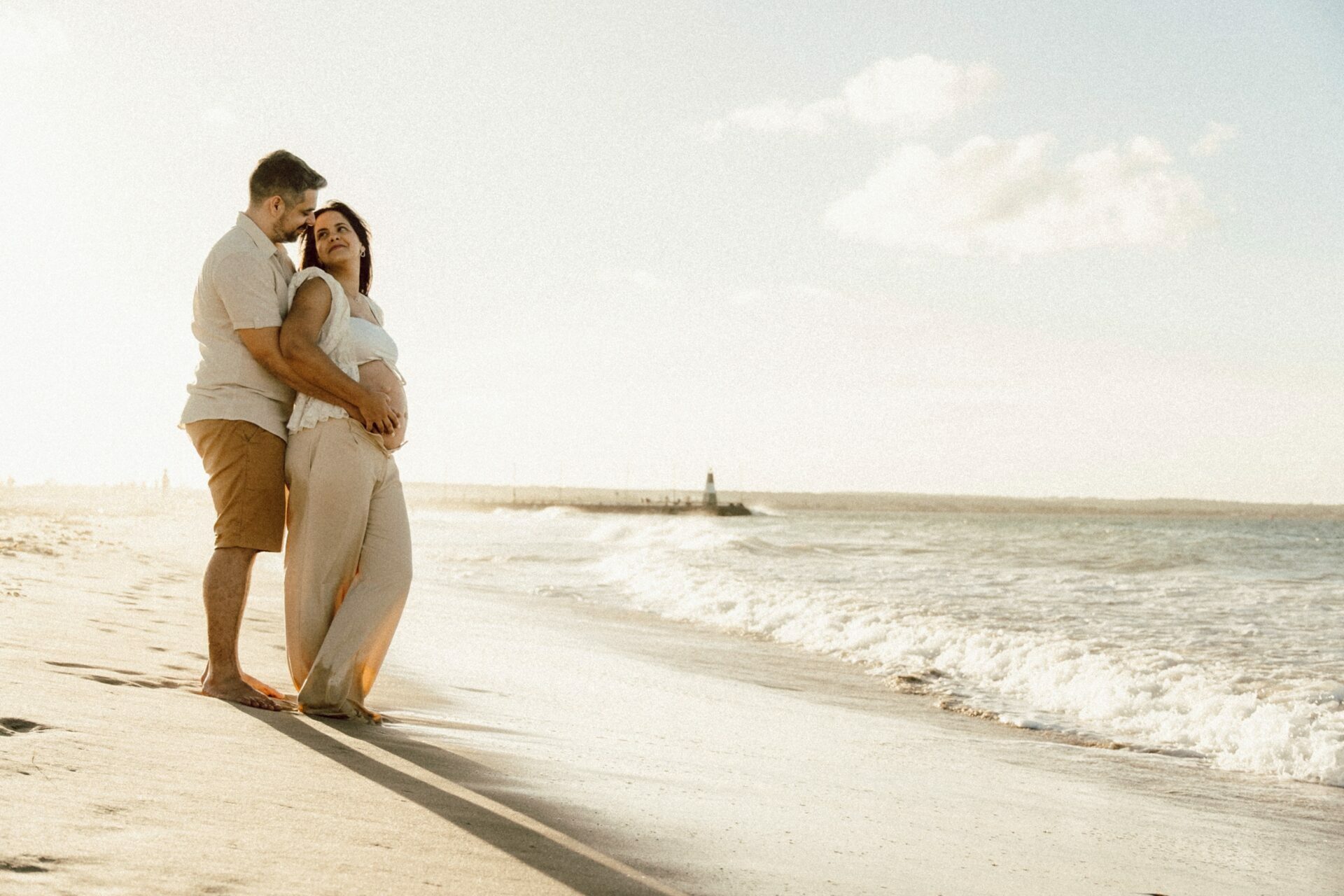 Vindos de Portugal, atravessaram o Atlântico para rever a família, abraçar suas raízes e reencontrar o calor da nossa querida João Pessoa. E foi nesse cenário de mar calmo e céu infinito que eternizaram um dos momentos mais sublimes da vida: a espera por mais um filho.