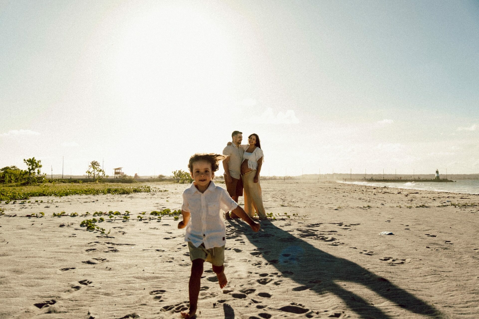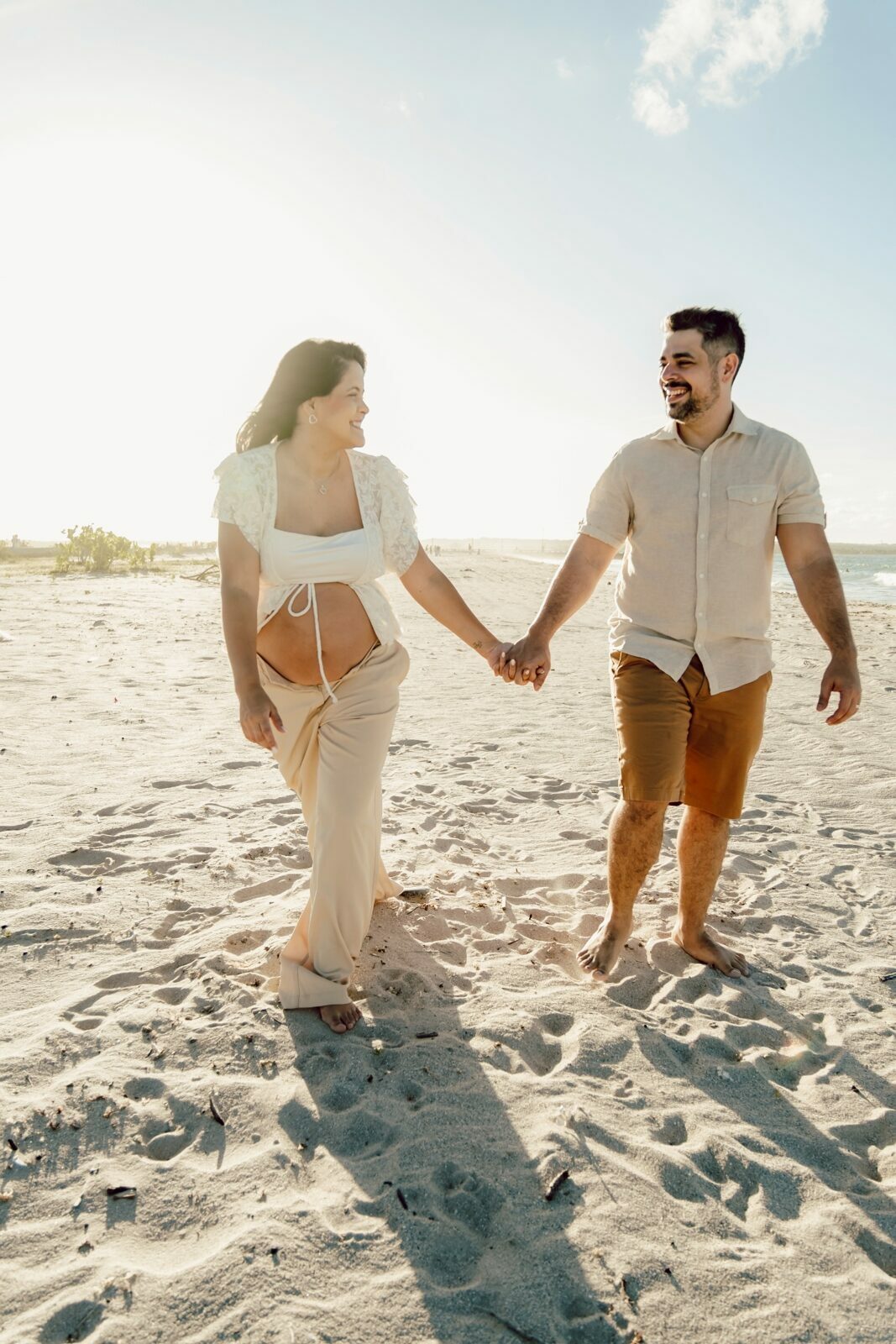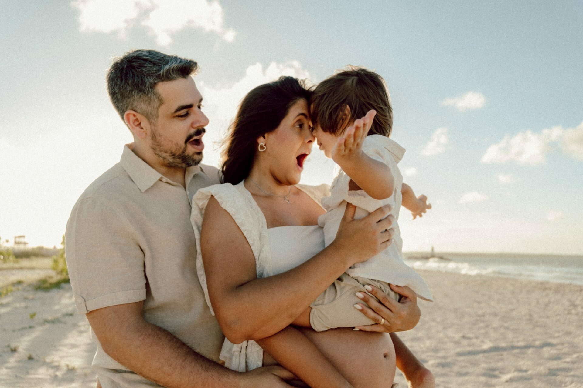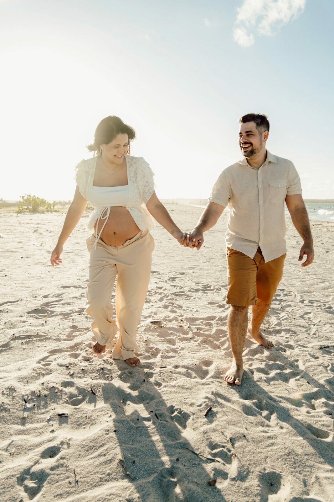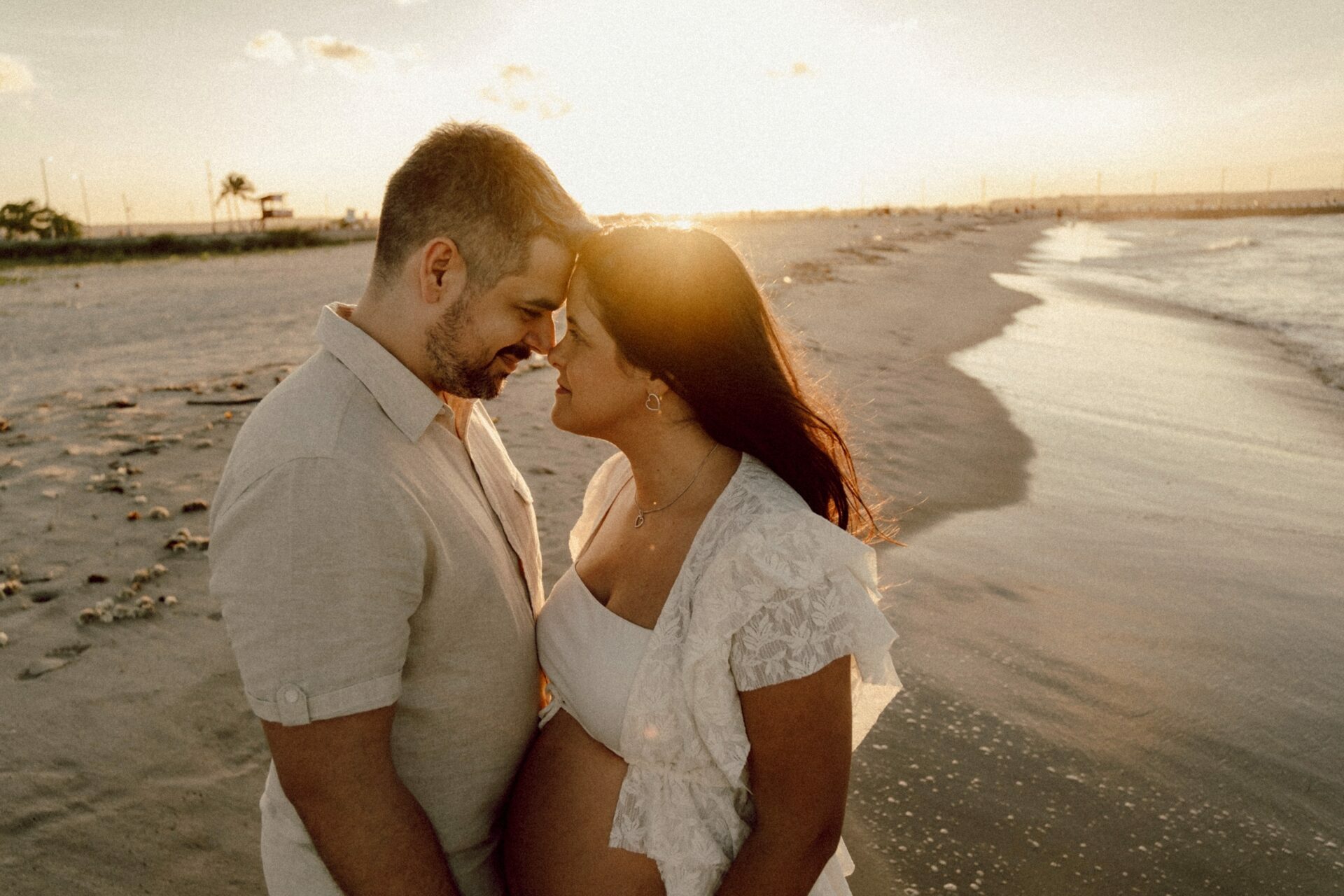 Vindos de Portugal, atravessaram o Atlântico para rever a família, abraçar suas raízes e reencontrar o calor da nossa querida João Pessoa. E foi nesse cenário de mar calmo e céu infinito que eternizaram um dos momentos mais sublimes da vida: a espera por mais um filho.