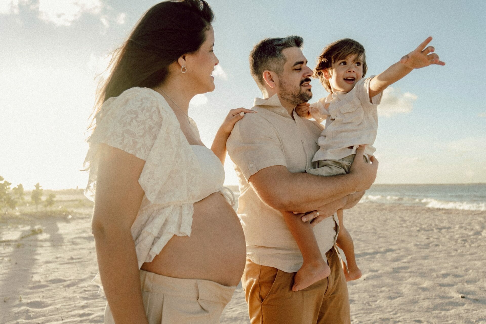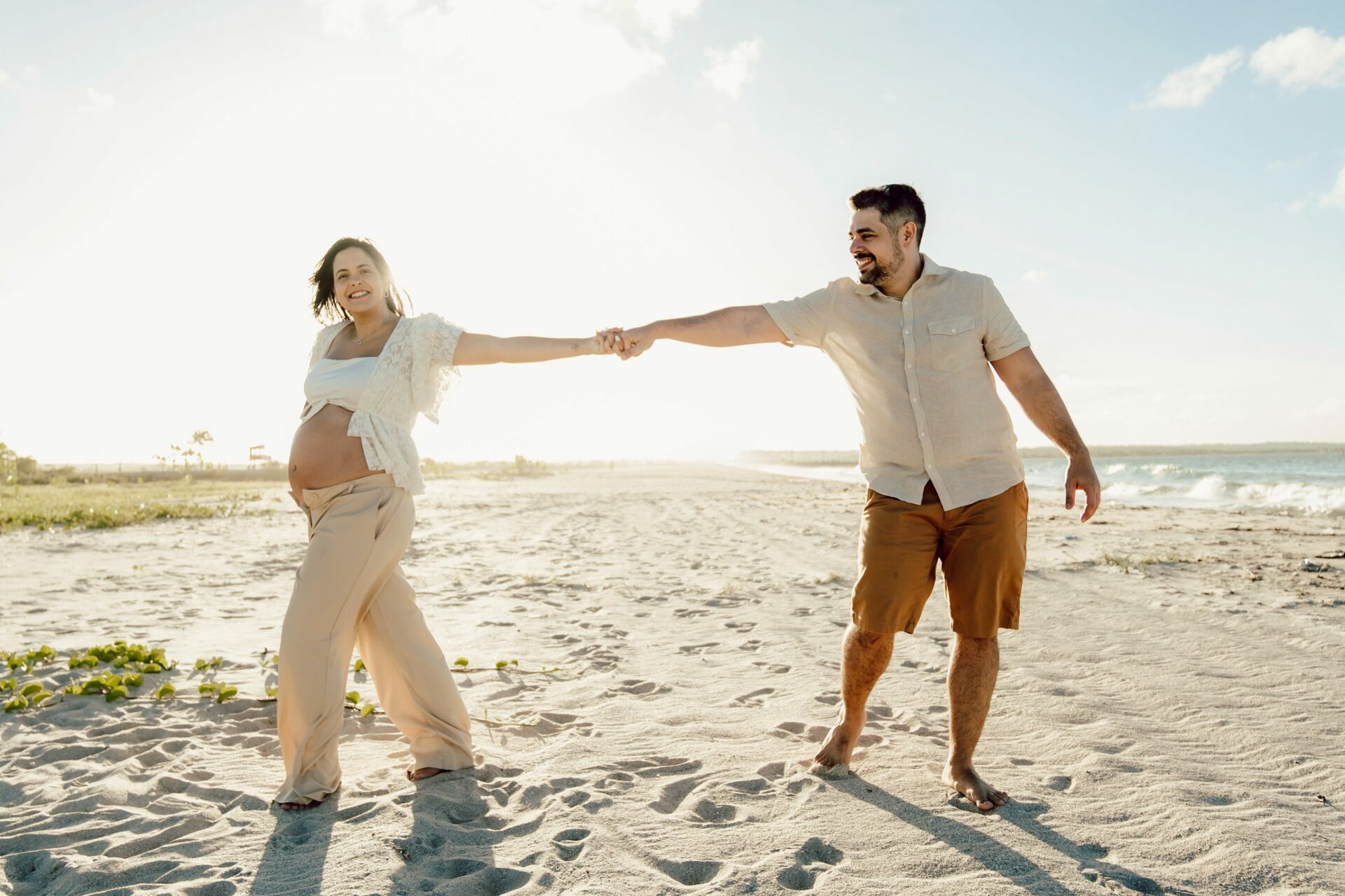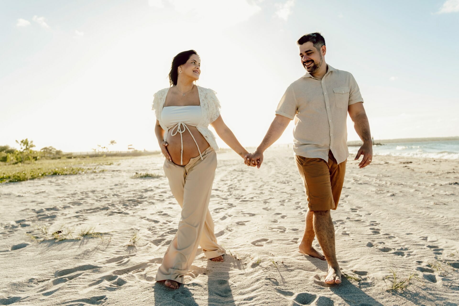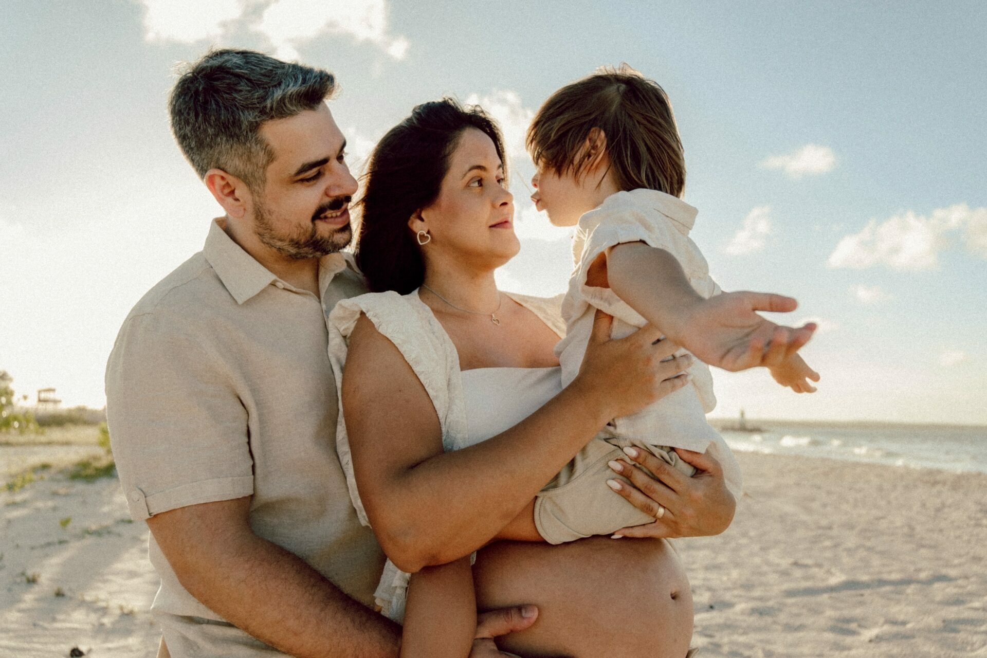 Vindos de Portugal, atravessaram o Atlântico para rever a família, abraçar suas raízes e reencontrar o calor da nossa querida João Pessoa. E foi nesse cenário de mar calmo e céu infinito que eternizaram um dos momentos mais sublimes da vida: a espera por mais um filho.